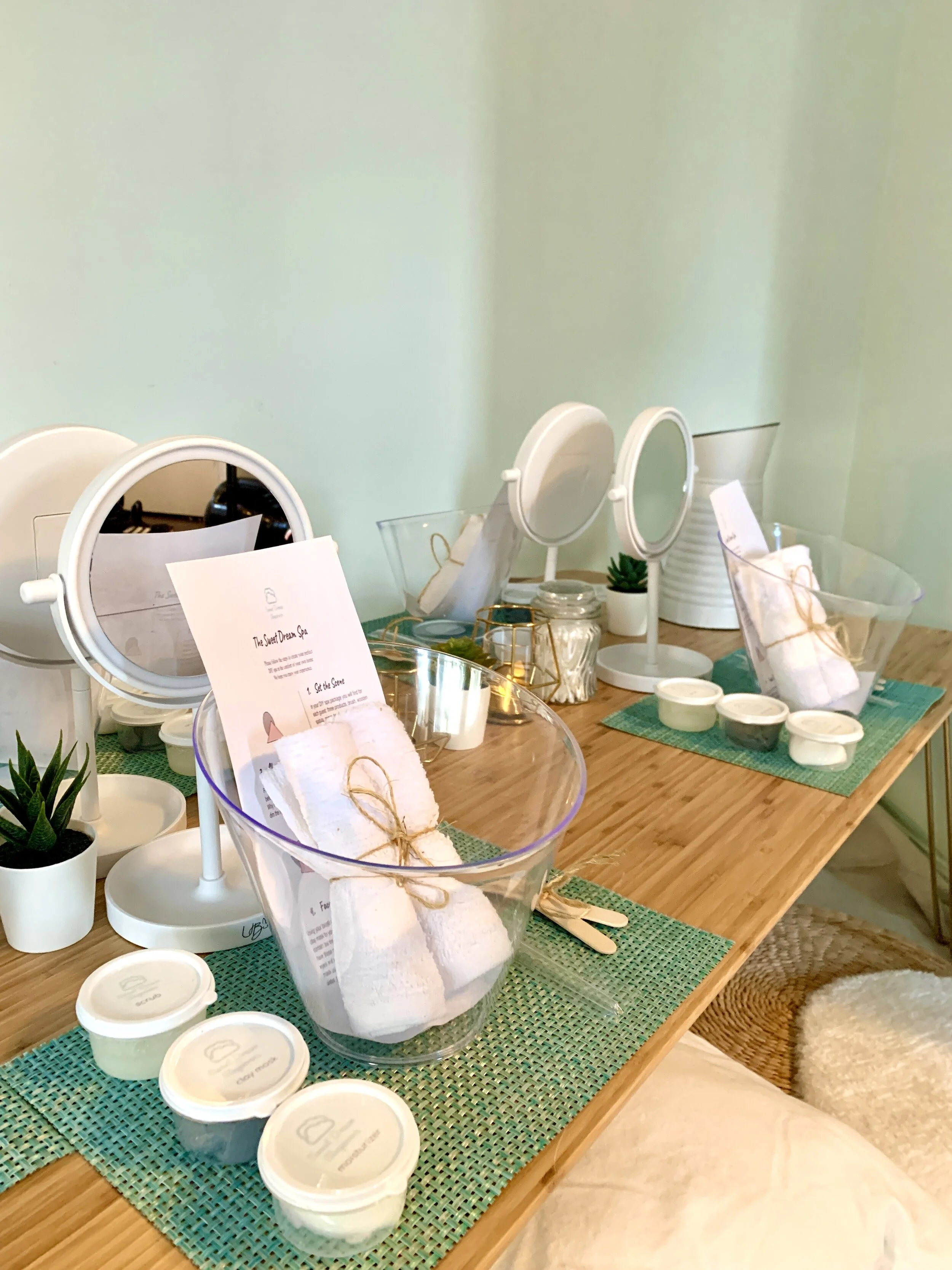 With the Deluxe DIY Slumber Spa each guest can expect a large water bowl, wash cloths, spatula, facial brush, scrub, clay mask, moisturizer, mirror, décor and accessories. All of which will be set up on a hand-crafted low table paired low seating and pillows on a canvas rug. $120 For a pamper station for 4. $30 for each additional setup.